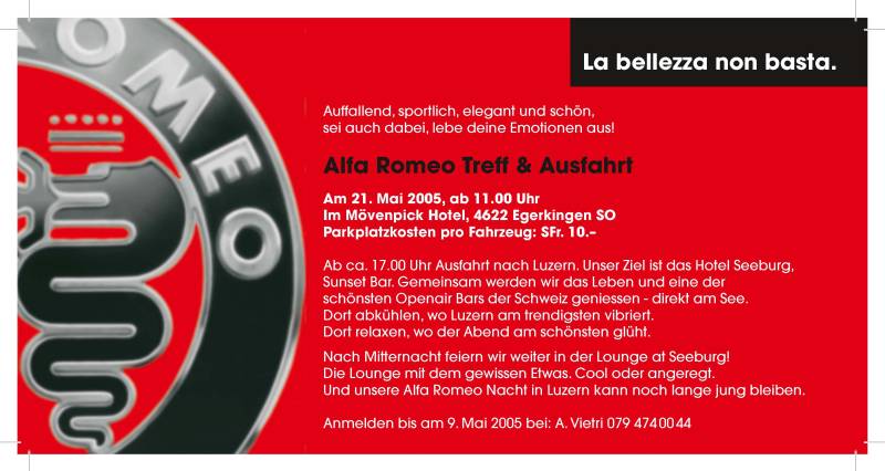 Ihr plant oder wisst von einem Alfa Romeo- oder Oldtimer-Event? Dann meldet dies uns via Email! |